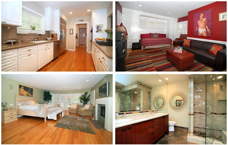 The interiors of Miss Meester's new west coast abode are typical of rambling suburban ranch homes in southern California, meaning there are too many too-low ceilings. To the right of the narrow entrance hall there's a living/dining room with honey-colored hardwood floors, plantation shutters over the wide bank of windows, and a wood-burning fireplace. It goes without saying, we hope, that Miss Meester has the good decorative sense to hire a nice, gay decorator to do something–anything–with that disturbing, fleshy-pink wall color in the living/dining room.